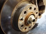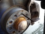 Remove axle nut dust cap with prying tools and a hammer (be careful not to damage rotor or dust cap, you will need it later)